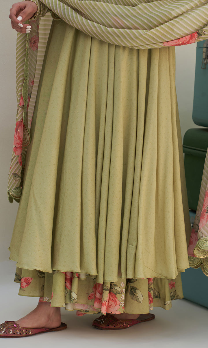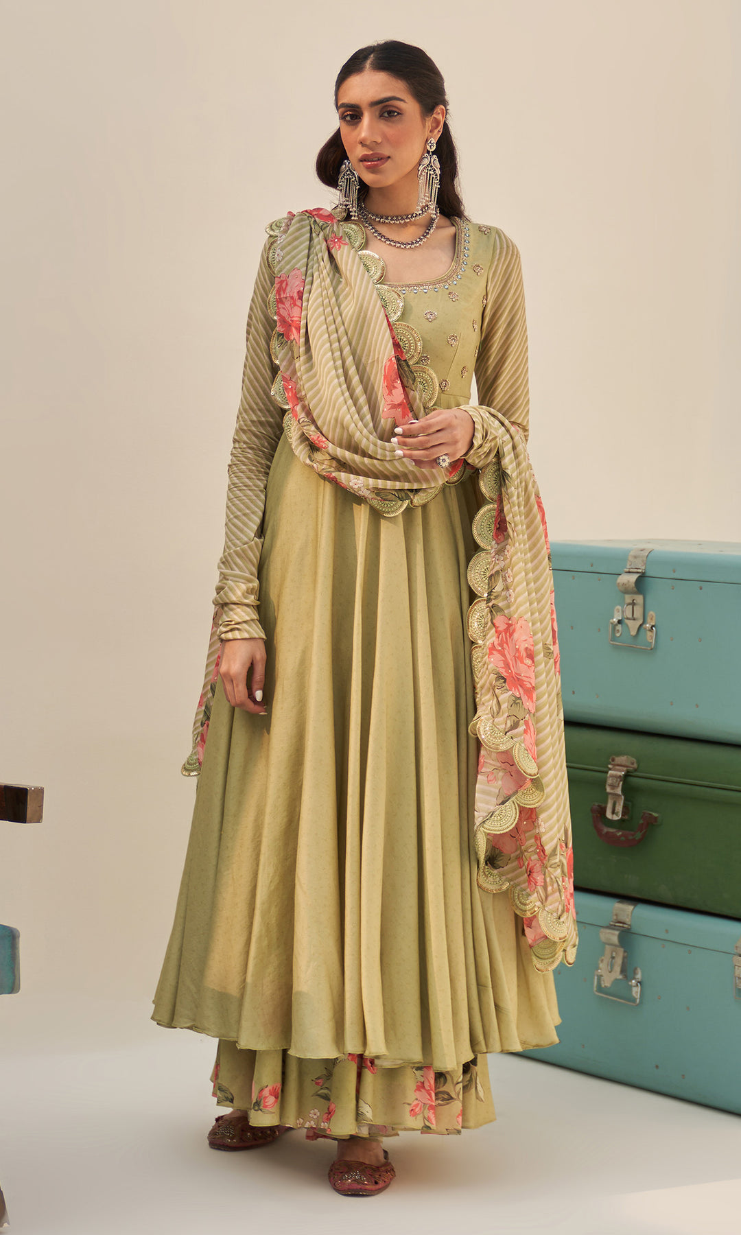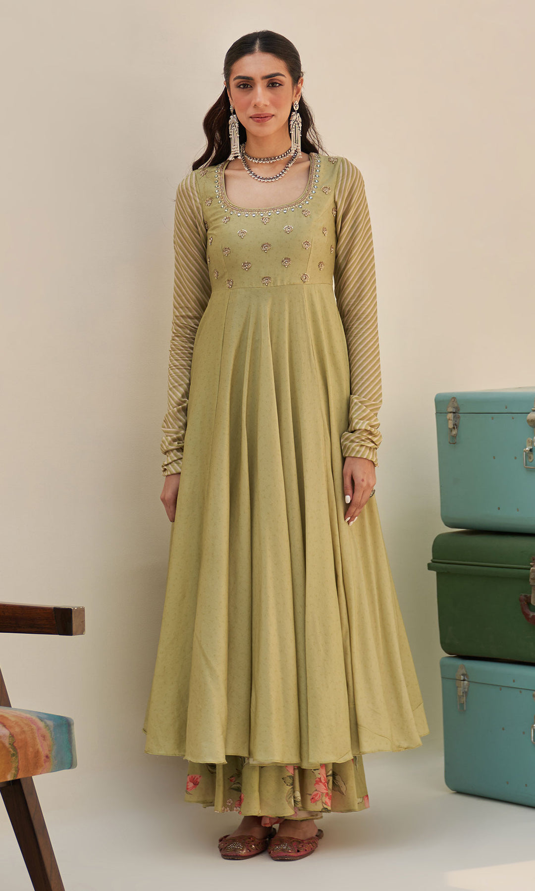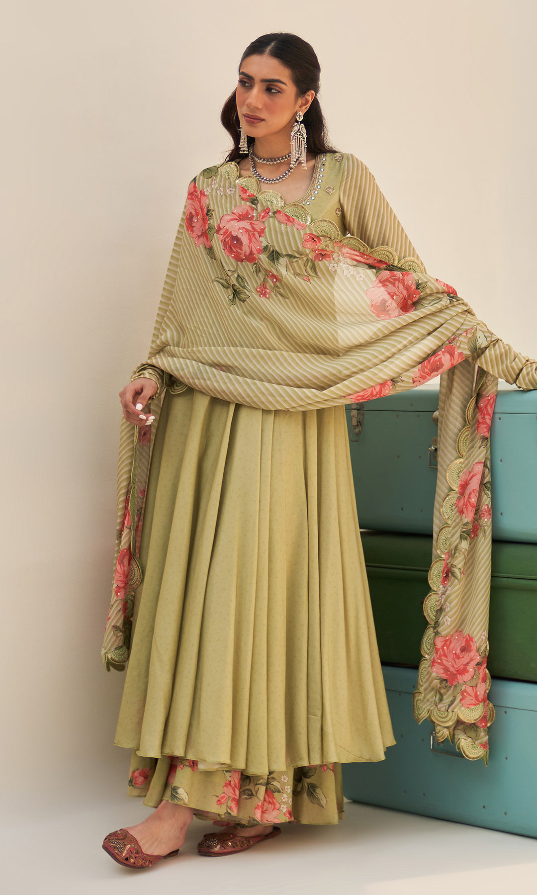 This set includes embroidered anarkali , floral printed sharara and dupatta. Anarkali yoke is embellished with sequins sequins , dabka and mirror work .It has chooridar sleeves . It comes with floral printed sharara and dupatta finished with lace .