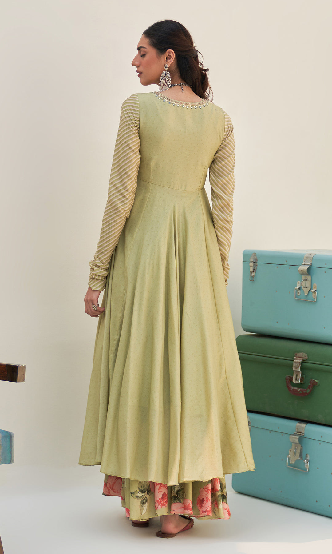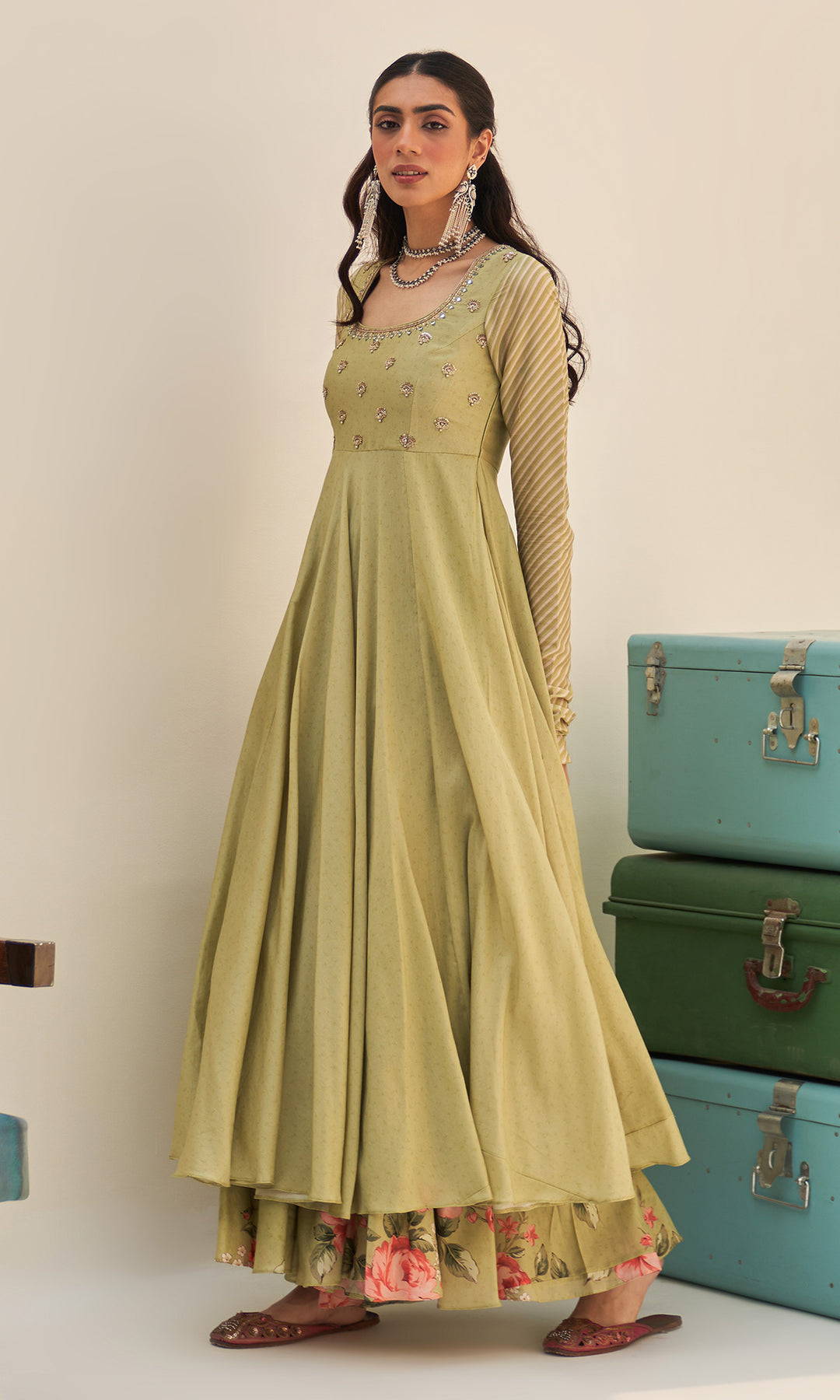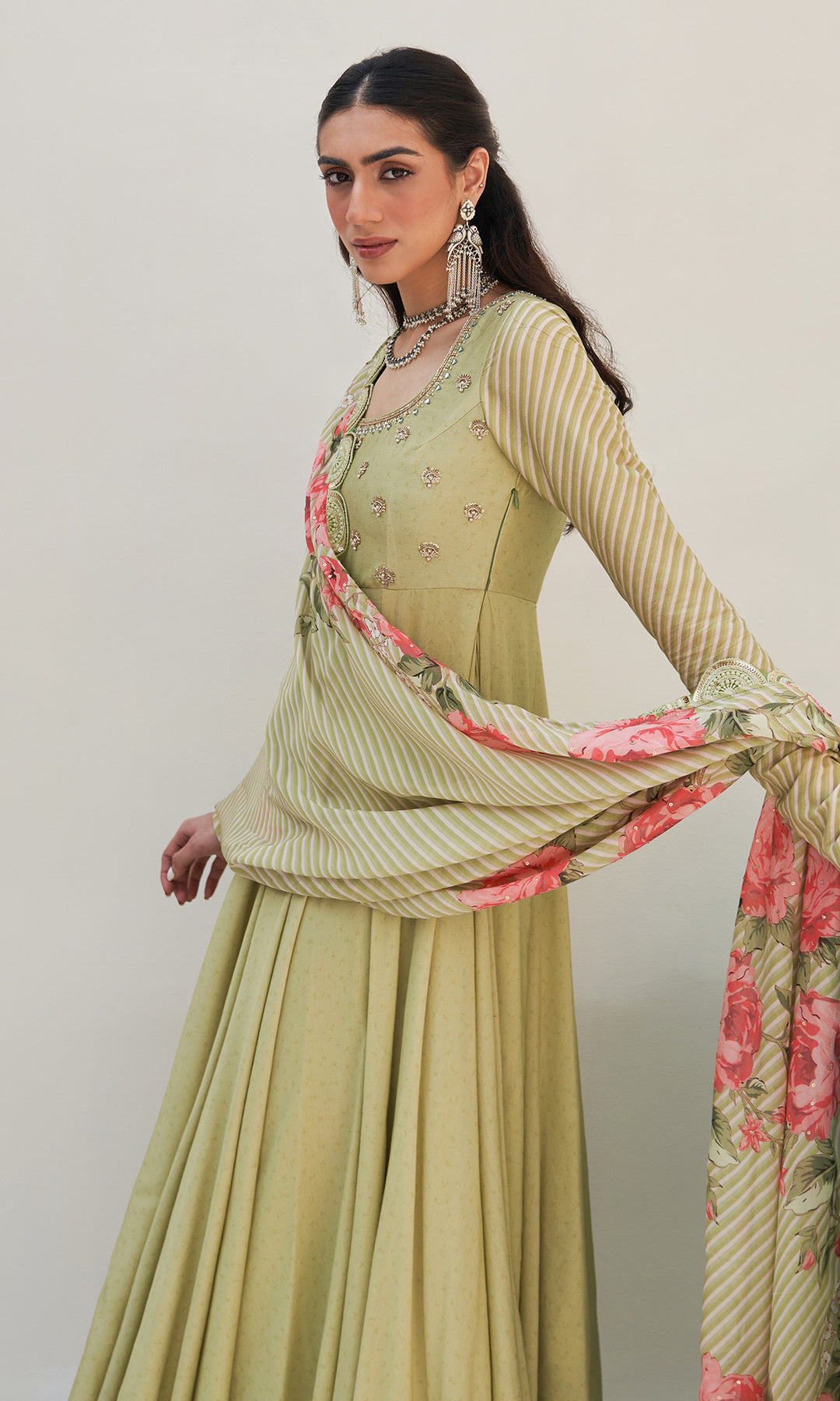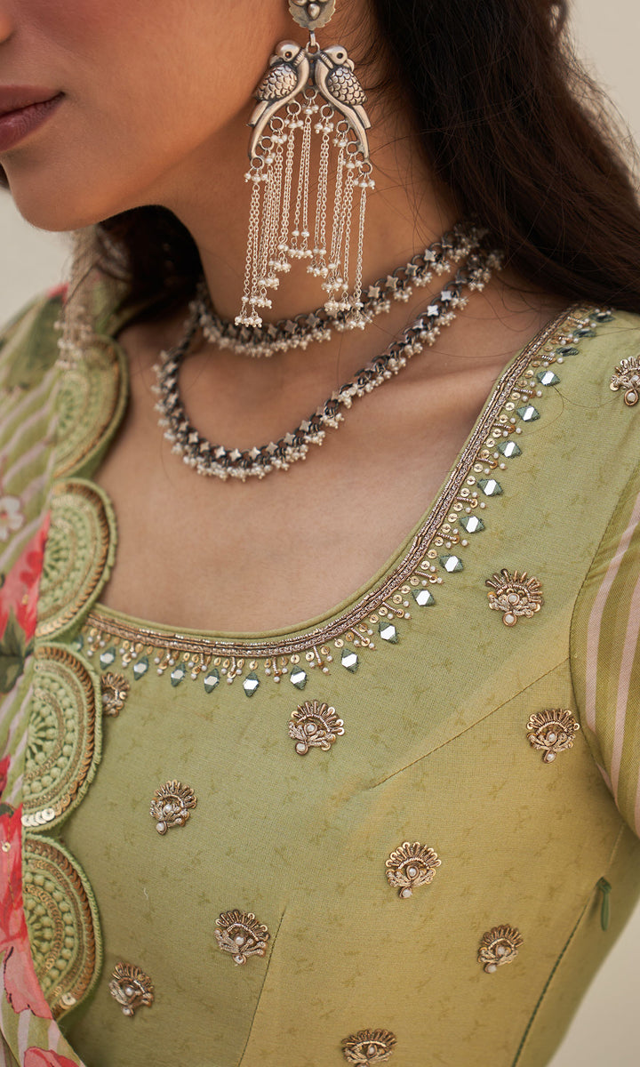 This set includes embroidered anarkali , floral printed sharara and dupatta. Anarkali yoke is embellished with sequins sequins , dabka and mirror work .It has chooridar sleeves . It comes with floral printed sharara and dupatta finished with lace .