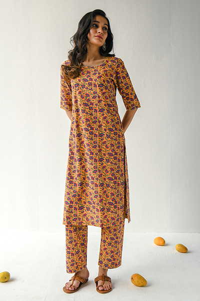 Noor Mustard Hand Block Printed Straight kurta with palazzo and Scarf - Set of 3