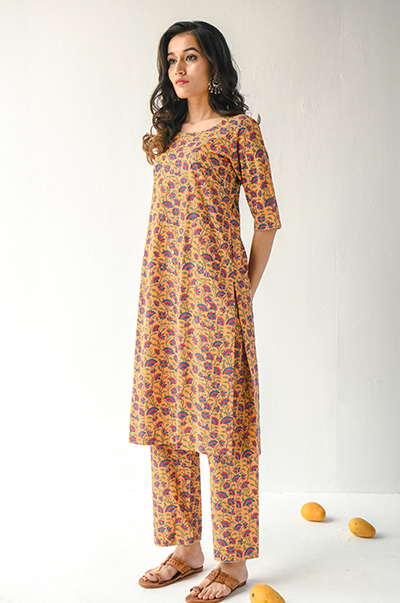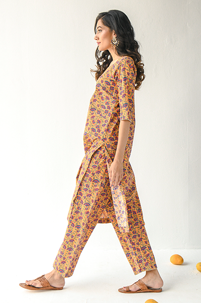 Hand Block Printed Straight Kurta with Kingri detailing. Block printed Palazzo with Mustard Chiffon Scarf with kingri detailing finished with tassels.