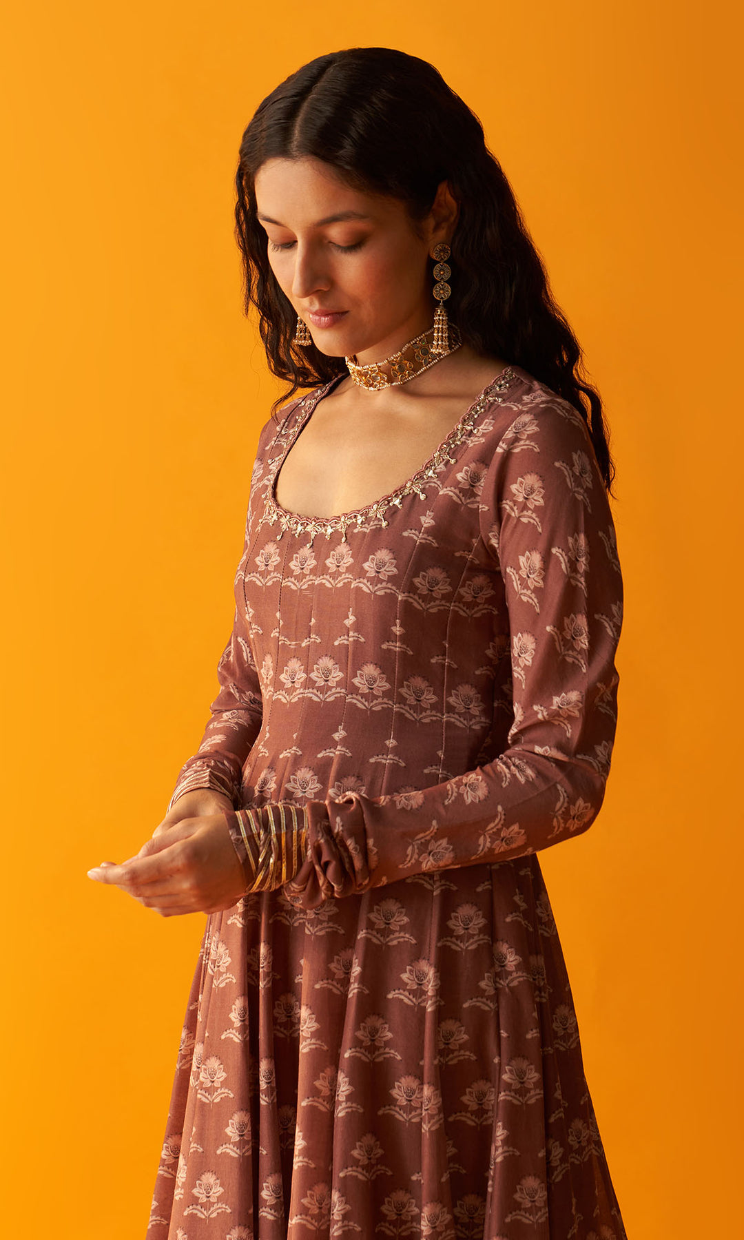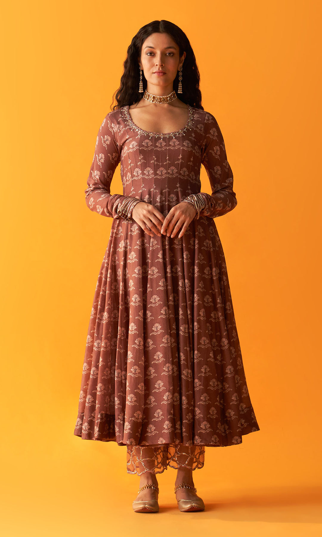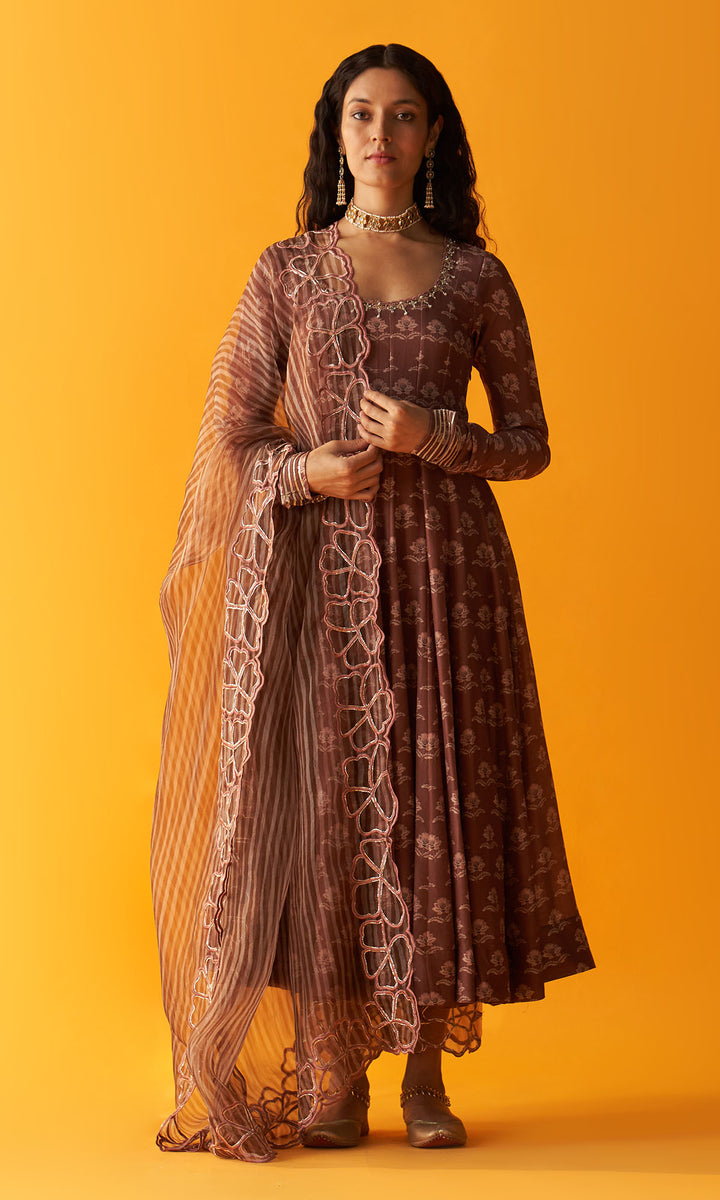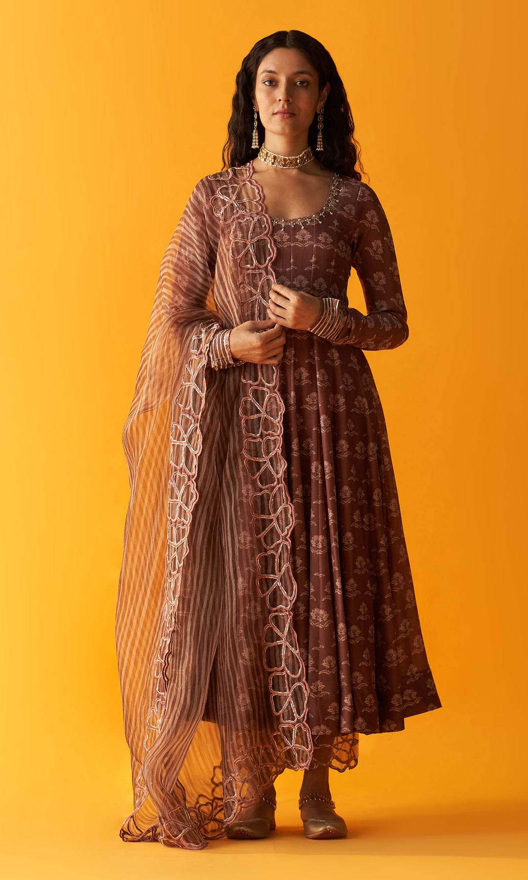 This set includes floral printed Anarkali with palazzo and organza dupatta.Anakali is detailed with hand embroidery and chooridar s leeves .It comes with embroidered palazzo.Dupatta is detailed with hand and machine embroidary.