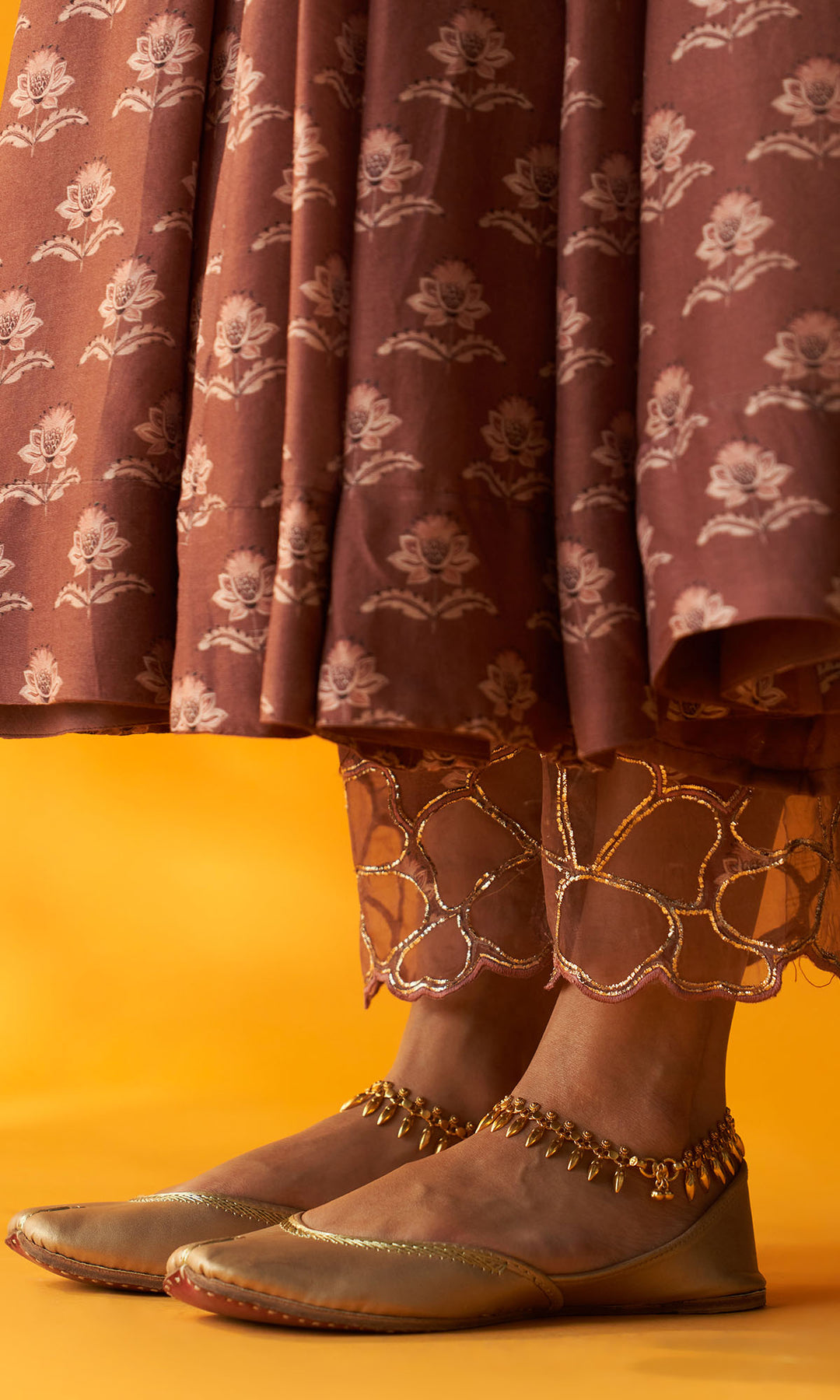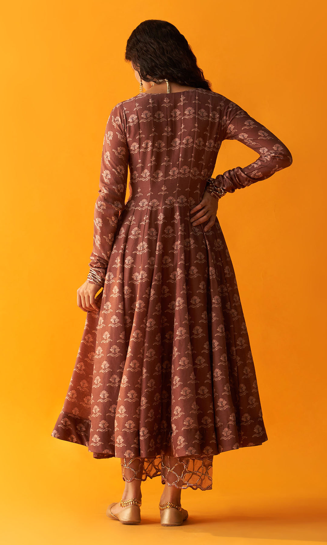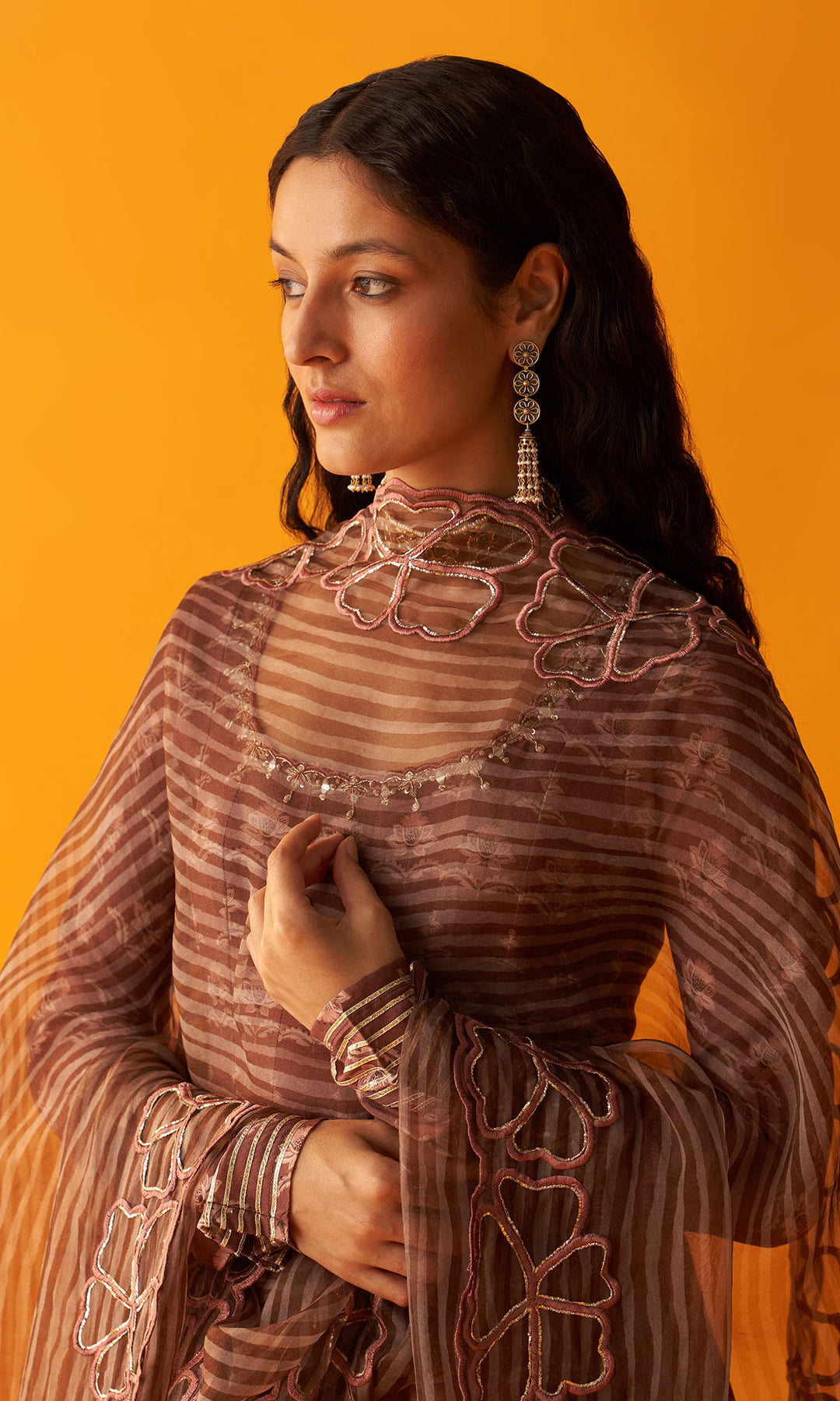 This set includes floral printed Anarkali with palazzo and organza dupatta.Anakali is detailed with hand embroidery and chooridar s leeves .It comes with embroidered palazzo.Dupatta is detailed with hand and machine embroidary.