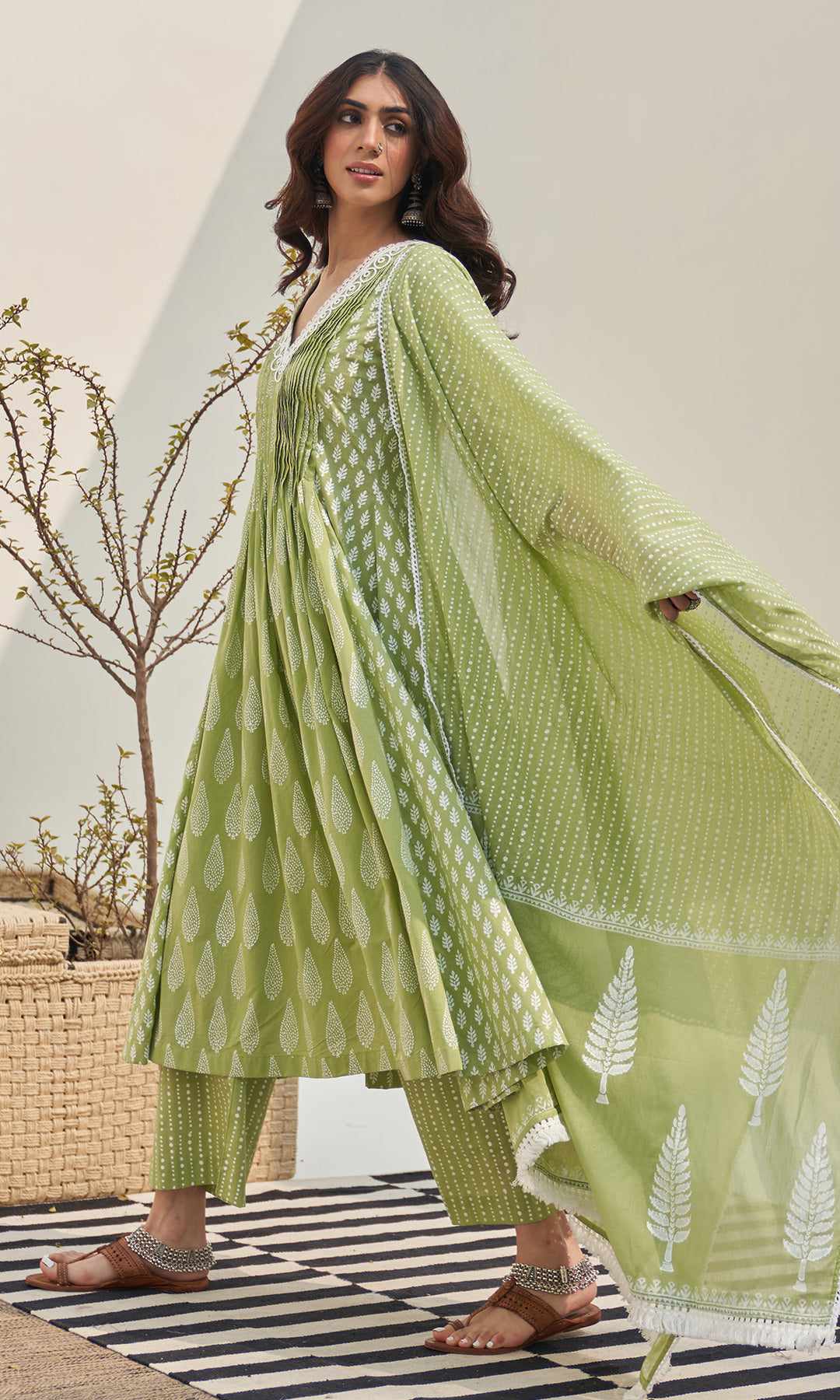 This set includes block printed pintuck kurta , Palazzo and dupatta. Lace detailing on neck and sleeves . It comes with block printed palazzo and dupatta.