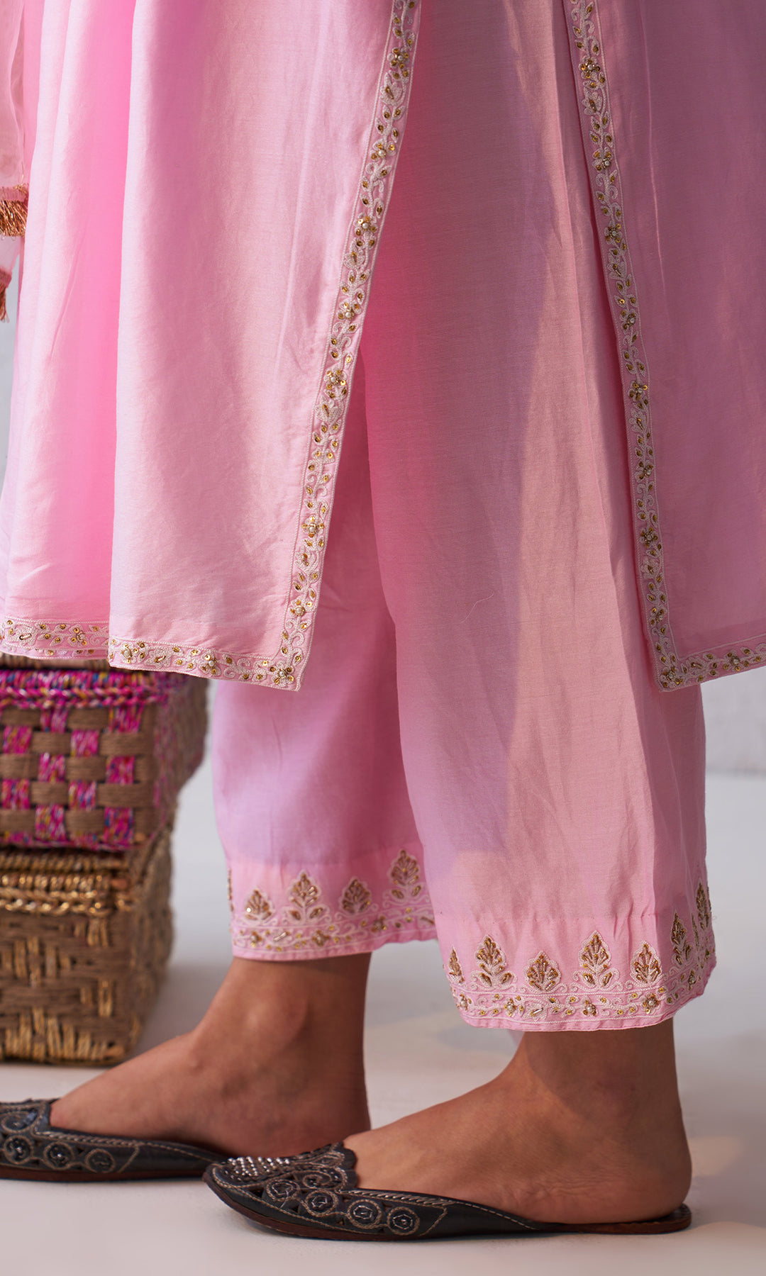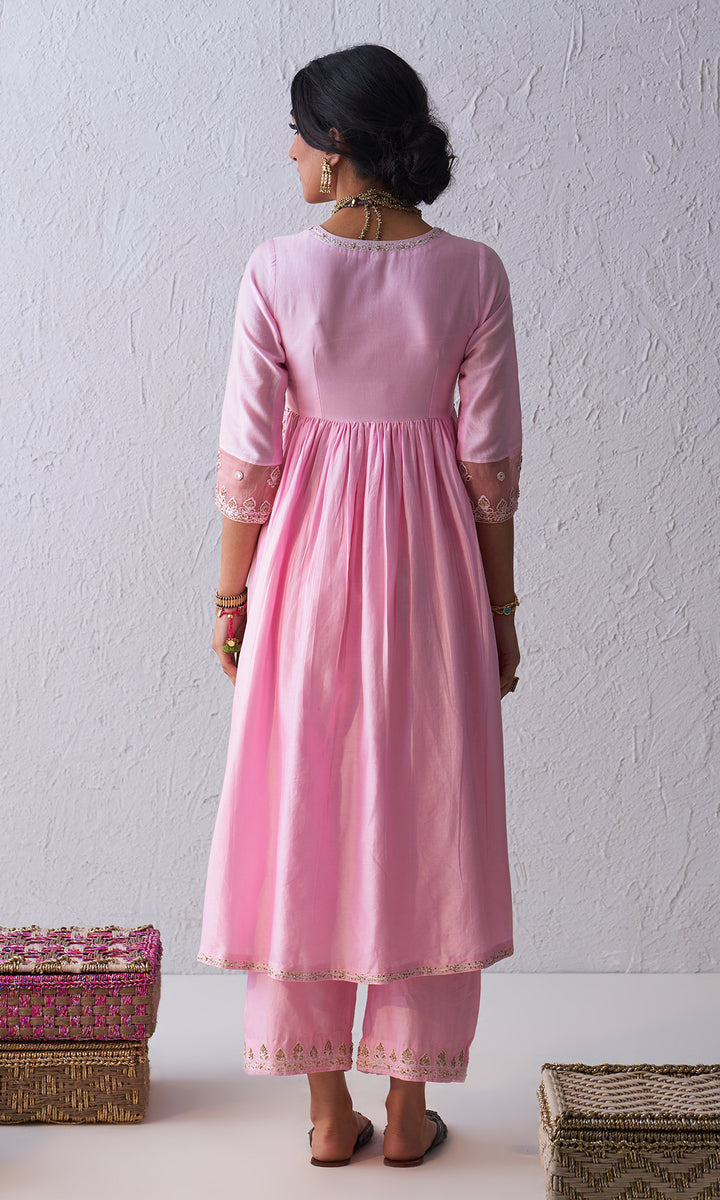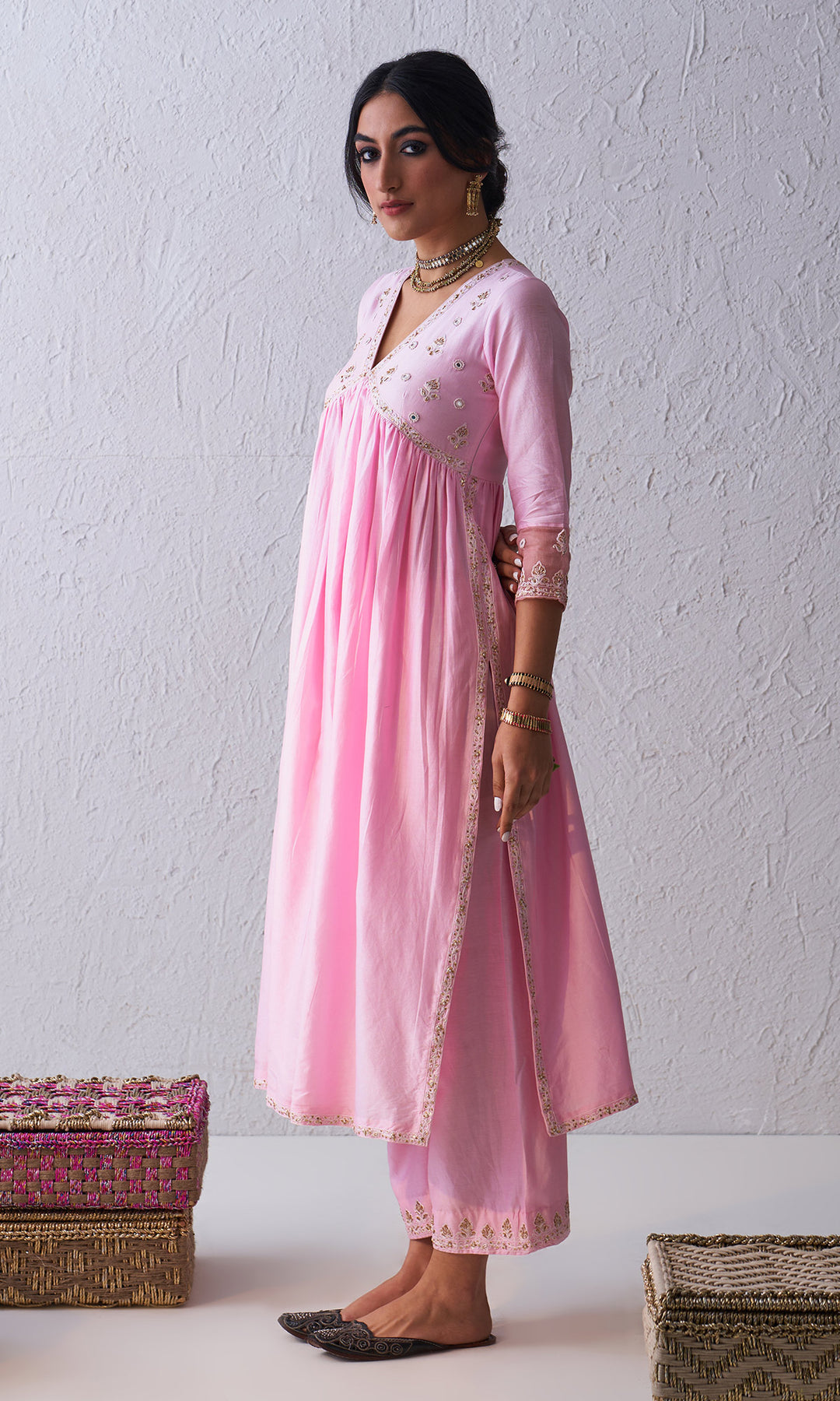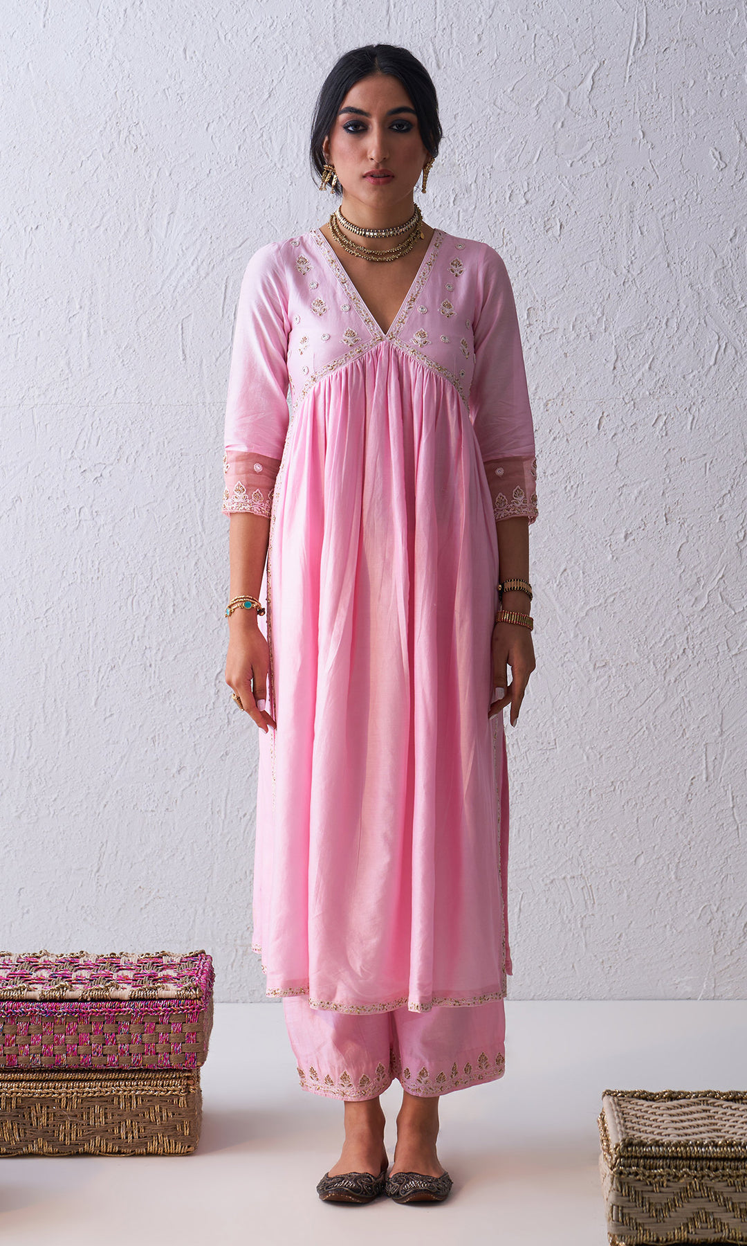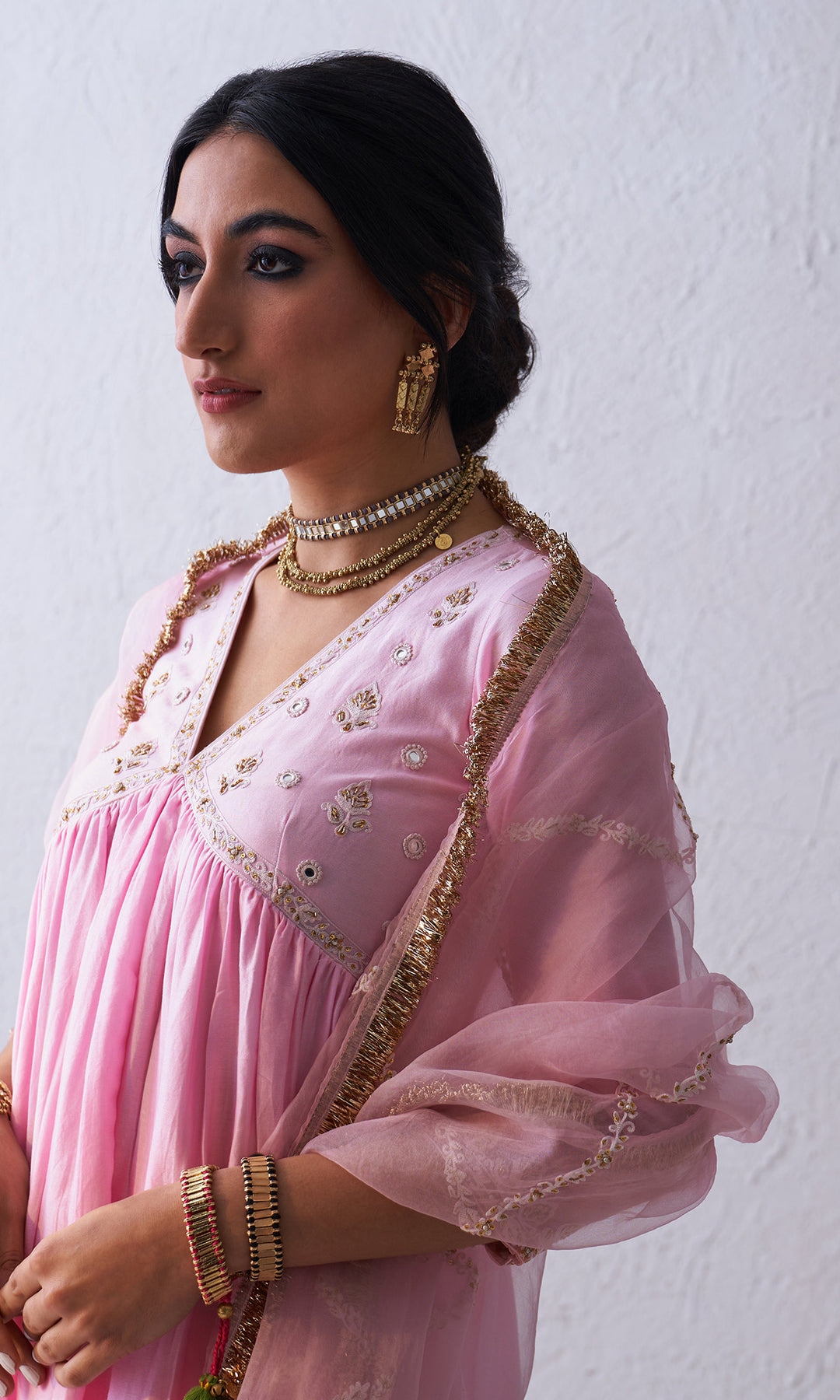 Qabila Pink V-neck Emnroidered Anarkali Set - Set Of 3