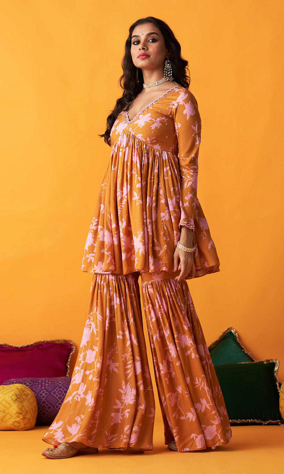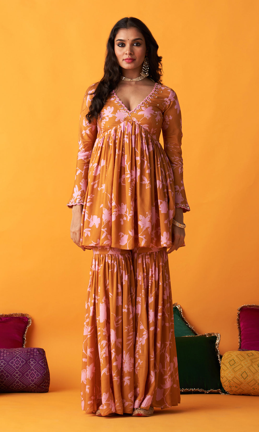 This set includes digital printed V neck Kurta, garara and dupatta. Kurta is embellished with mirror, sequins and Resham work at the neck and sleeve. It comes with digitalprinted garara. Dupatta is detailed with hand embroidery and embellished with lace.