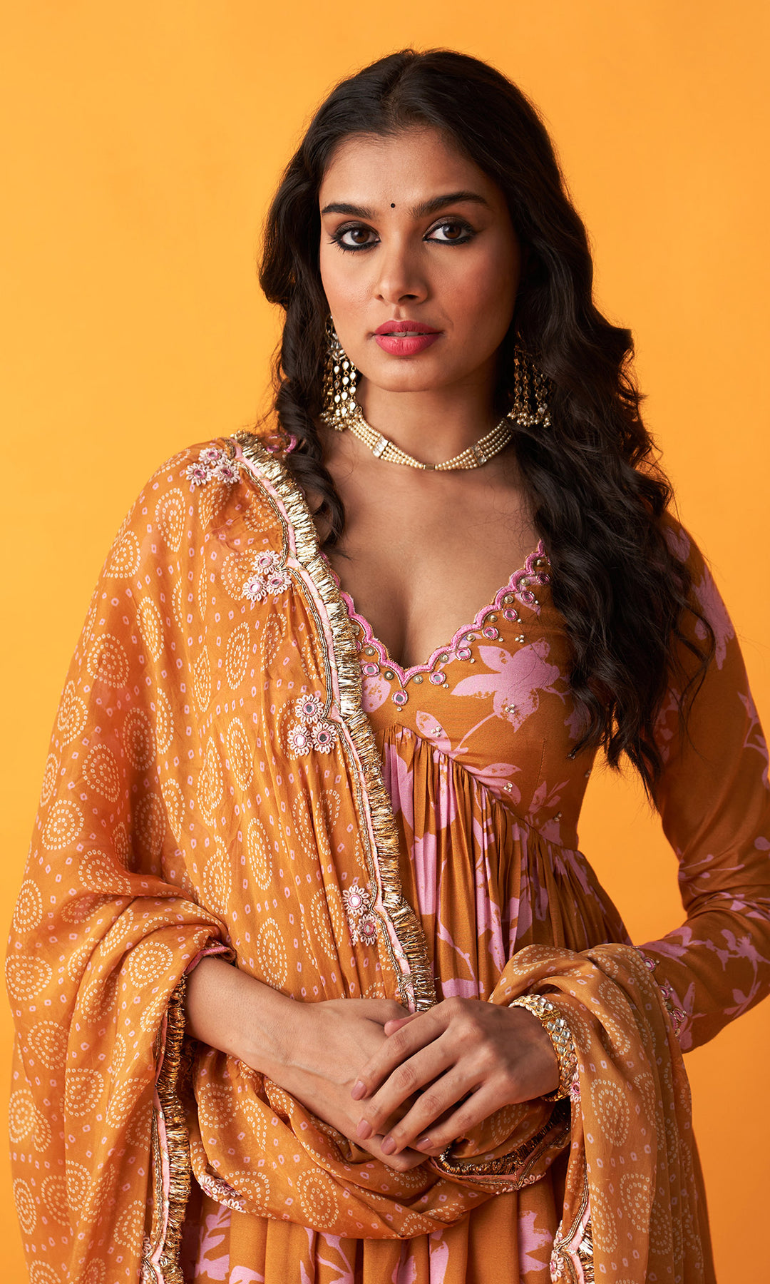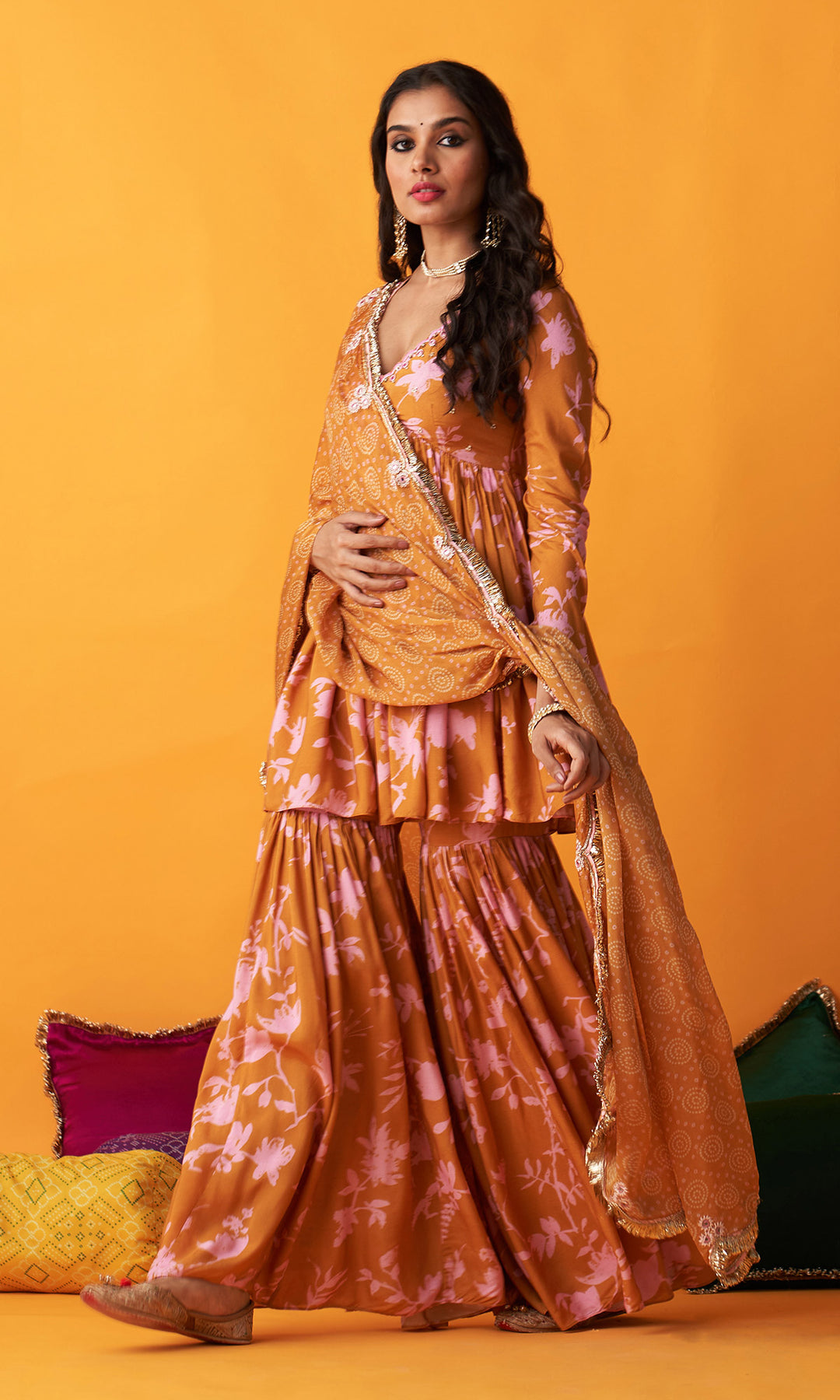 Rangreza 2.0 Bandhani Mustard Short V Neck Kurta with Garara and Dupatta (Set of 3)