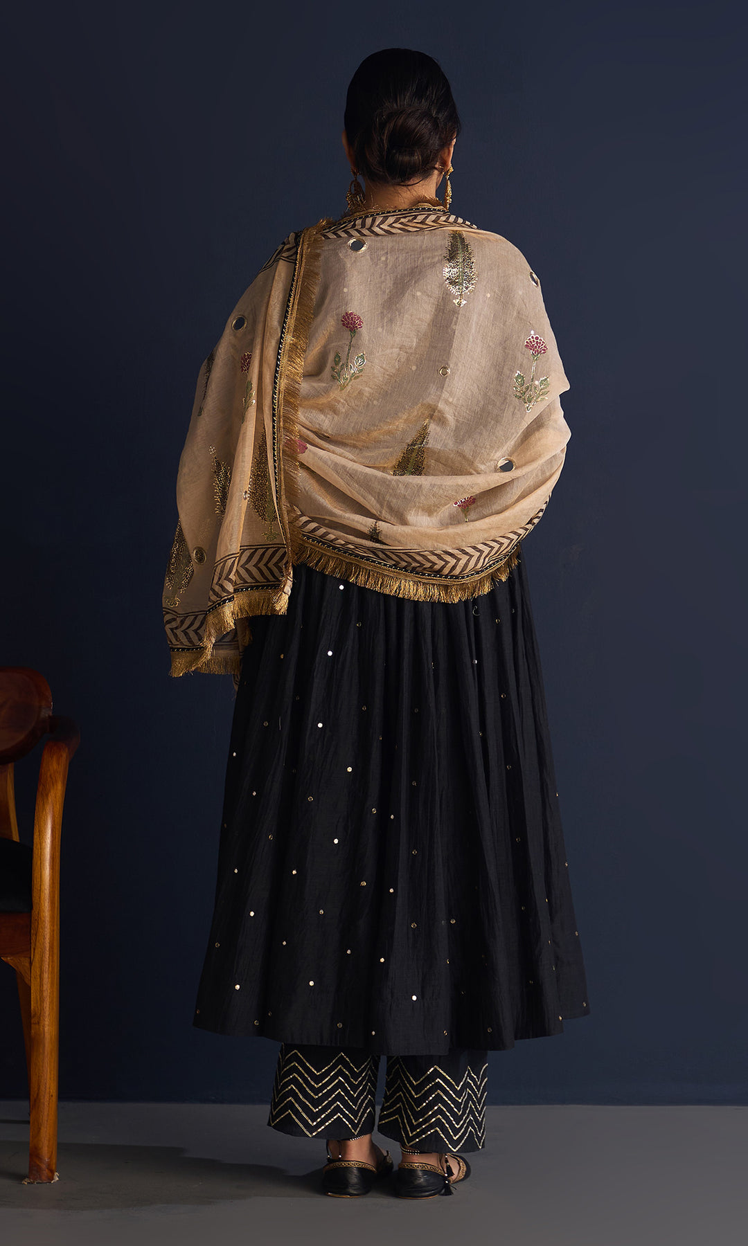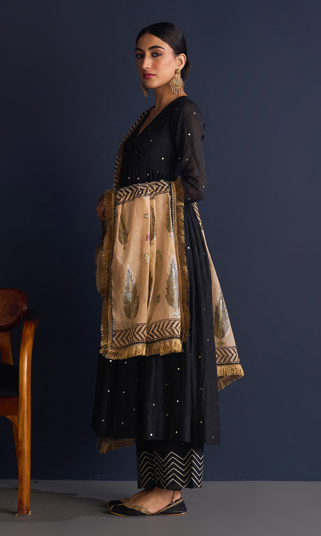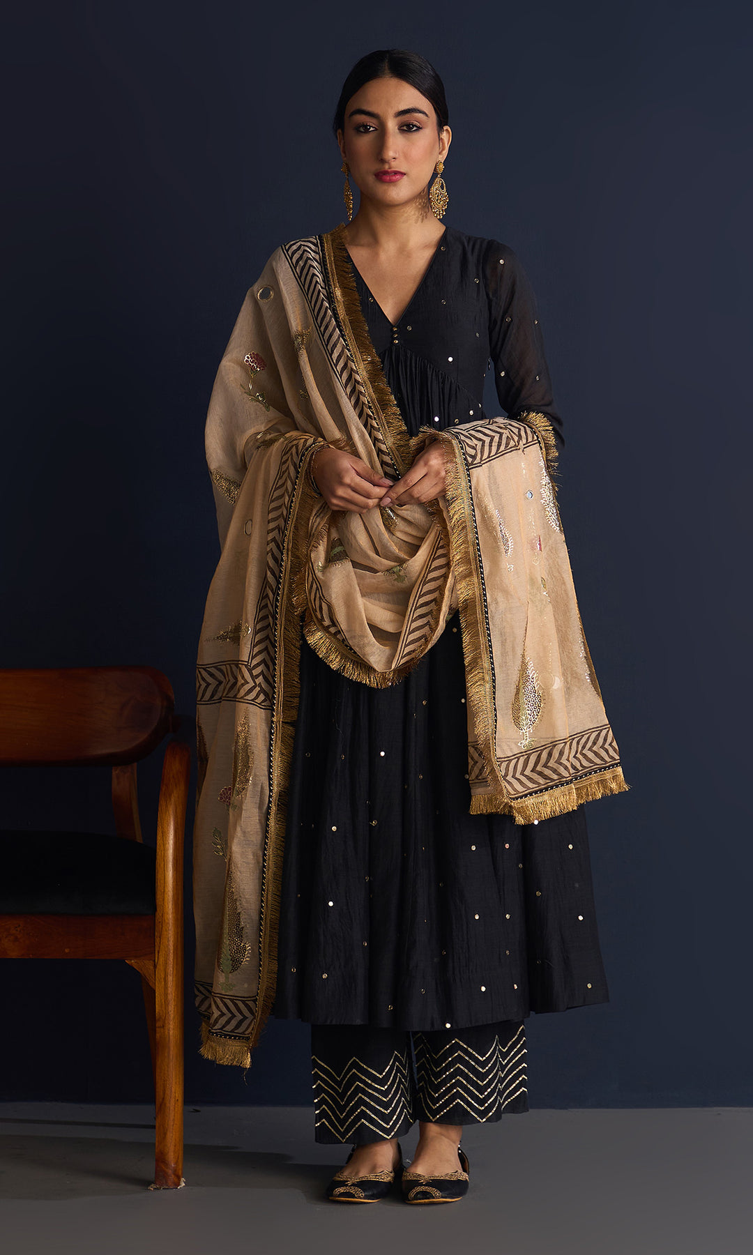 This set includes V neck anarkali , Palazzo and tissue foil block print dupatta. Block printed tissue dupatta is embellished with mirror work and lace.Palazzo is detailing with gota machine work.