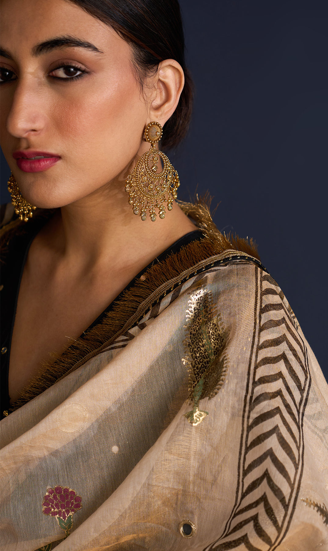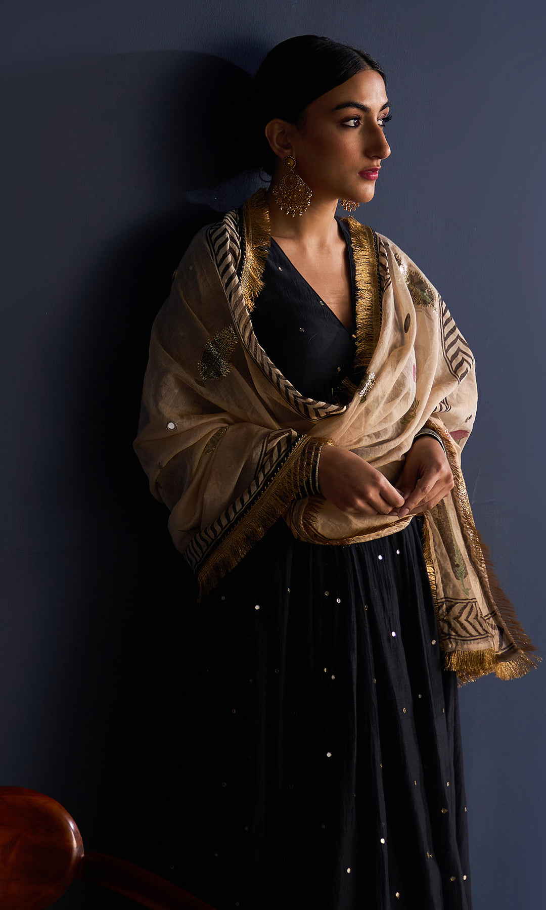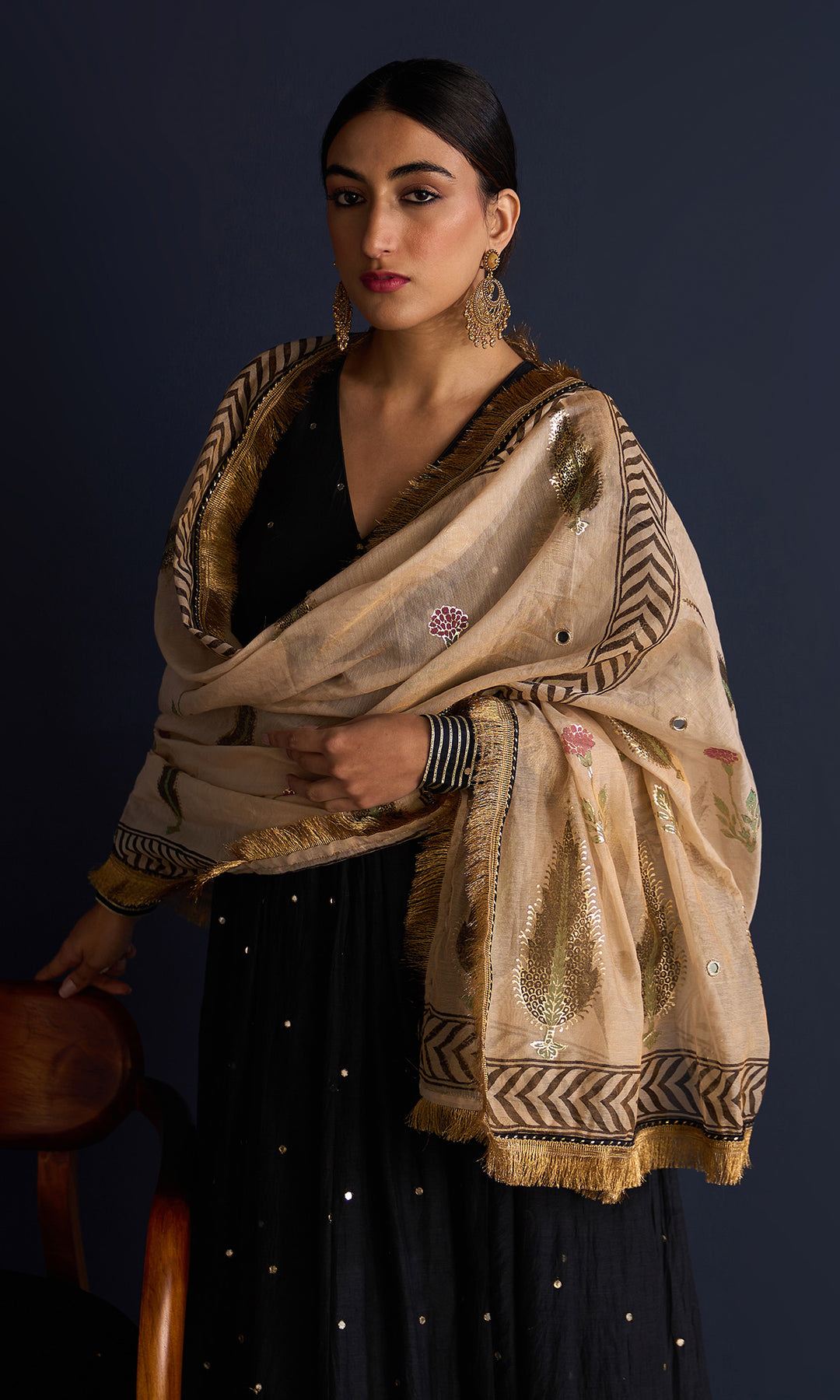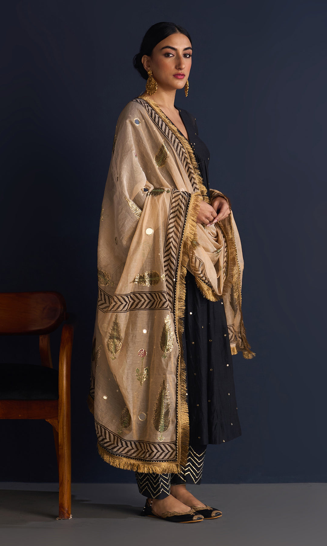 This set includes V neck anarkali , Palazzo and tissue foil block print dupatta. Block printed tissue dupatta is embellished with mirror work and lace.Palazzo is detailing with gota machine work.