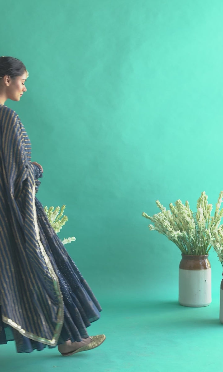 This set includes gold khari block printed tiered anarkali, chooridar and dupatta. Anarkali is in tiers and has chooridar sleeves. It comes with chooridar. Dupatta has dual shade gota and lace detailing on all four sides.