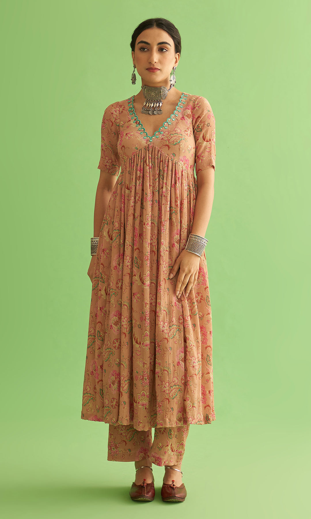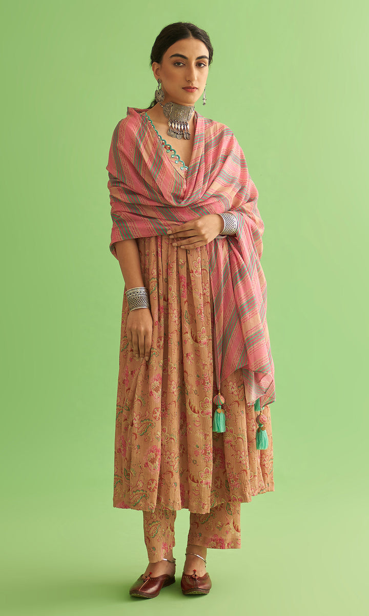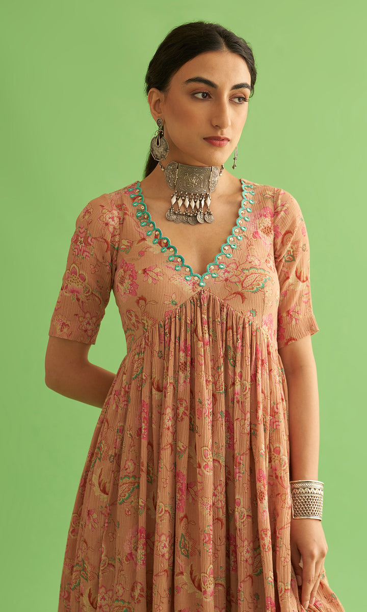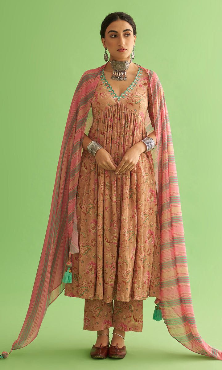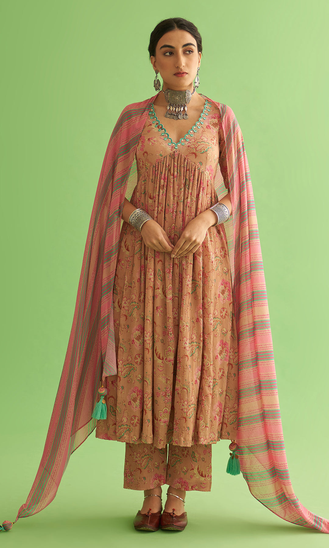 This set includes digital printed V neck anarkali, palazzo and dupatta. Anarkali is embellished with mirror, sequins and Resham work at the neck. It comes with digital printed palazzo and dupatta. Dupatta has tassels.