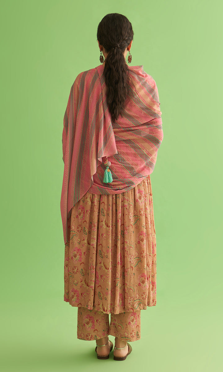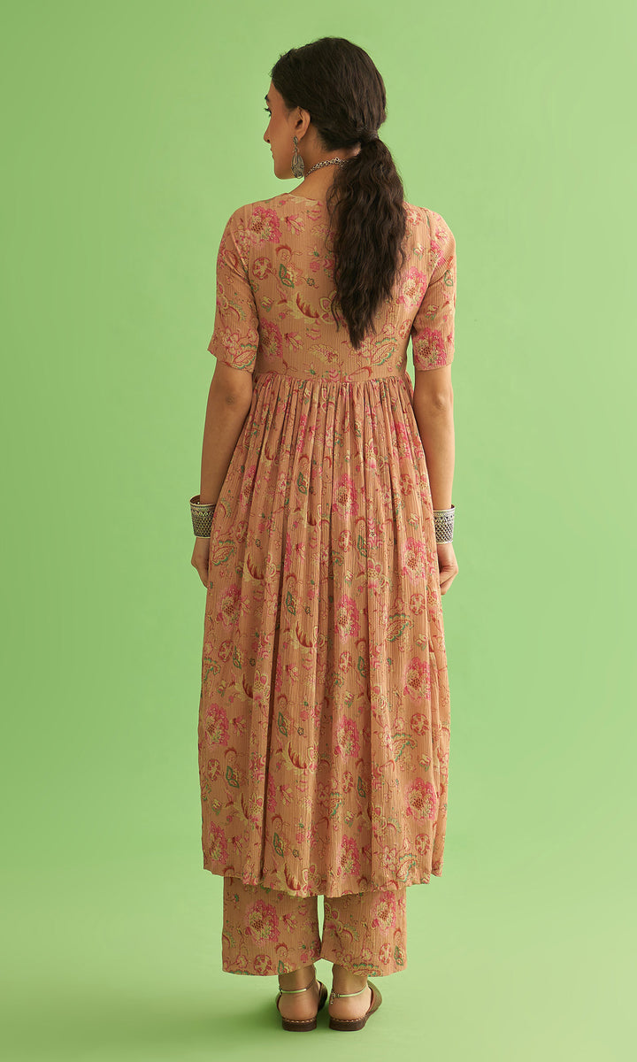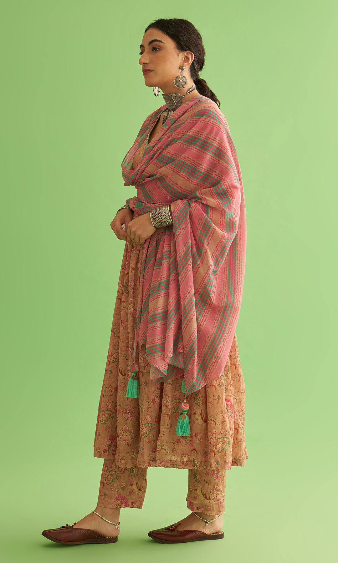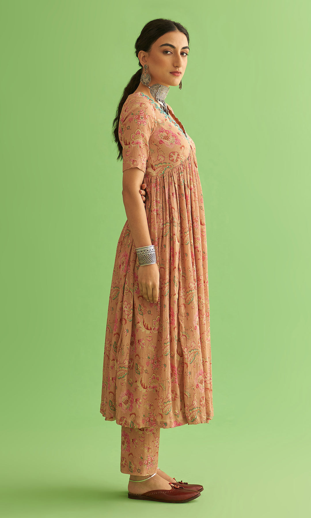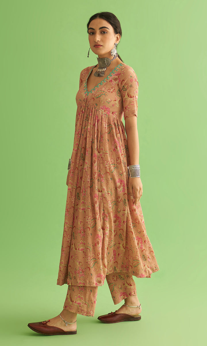 This set includes digital printed V neck anarkali, palazzo and dupatta. Anarkali is embellished with mirror, sequins and Resham work at the neck. It comes with digital printed palazzo and dupatta. Dupatta has tassels.