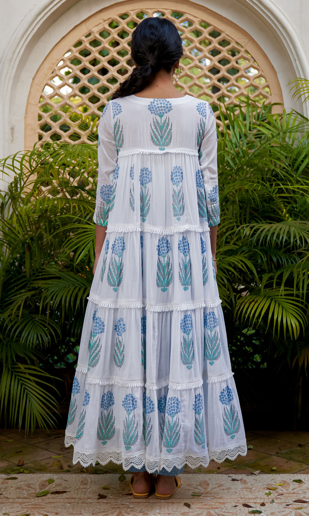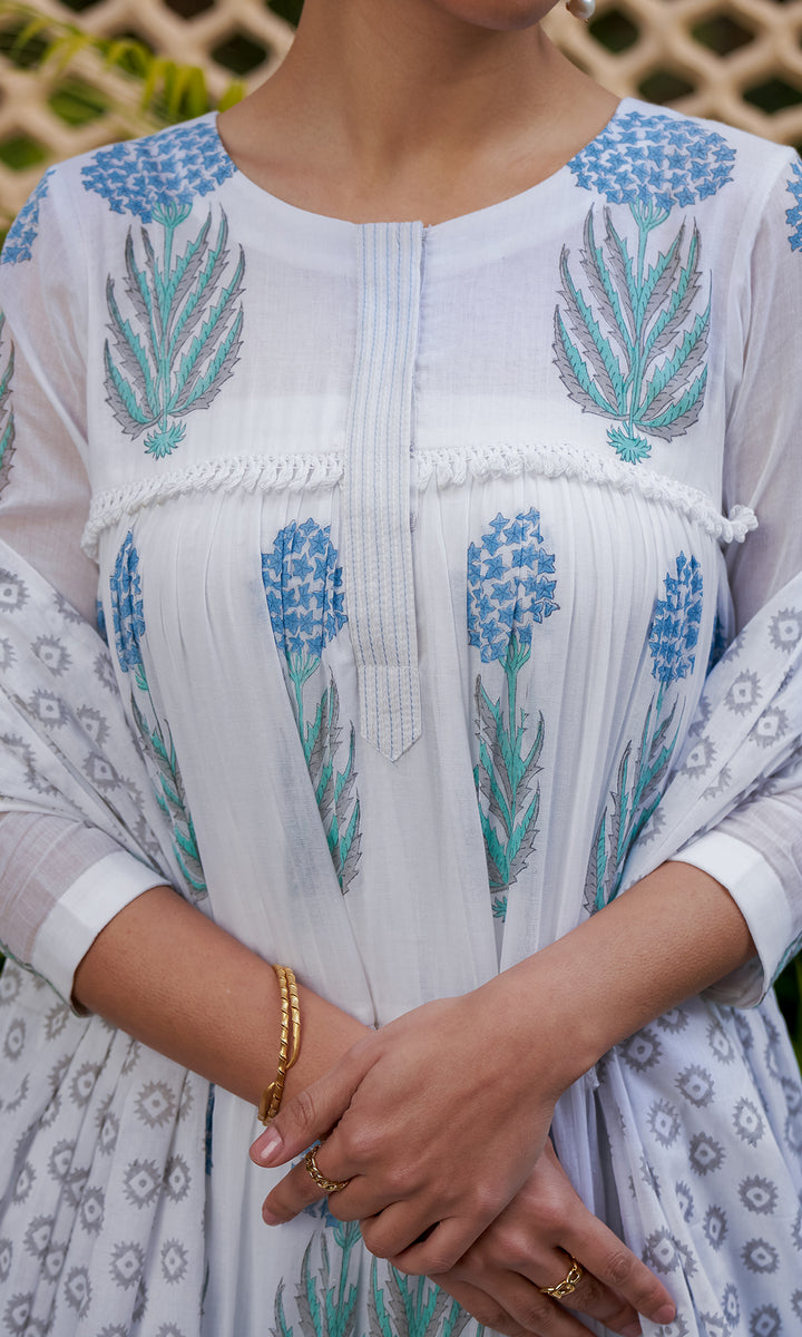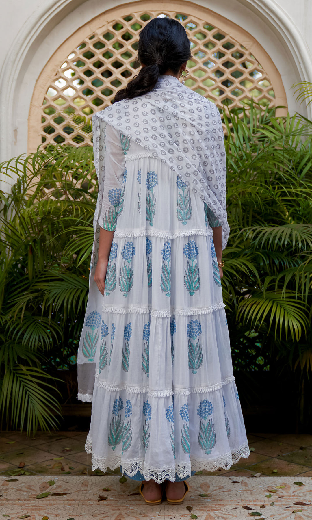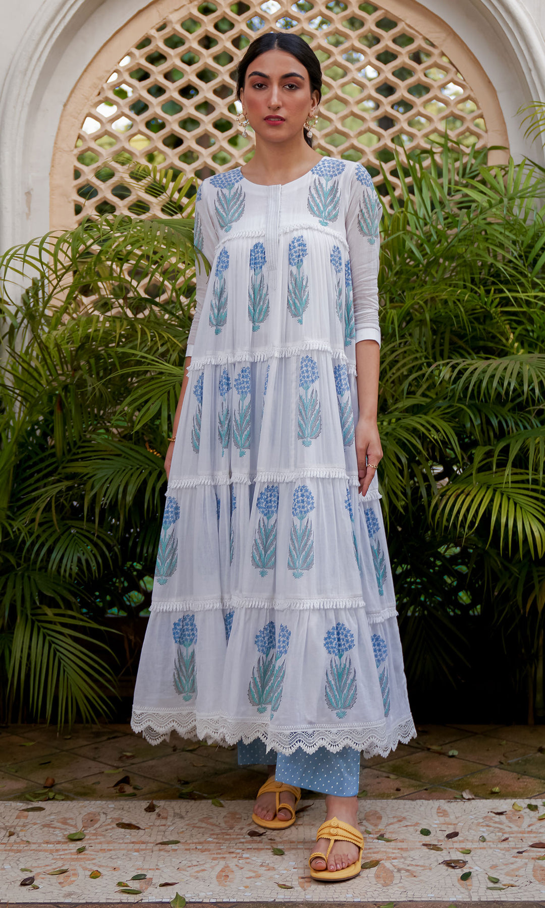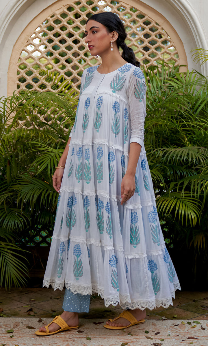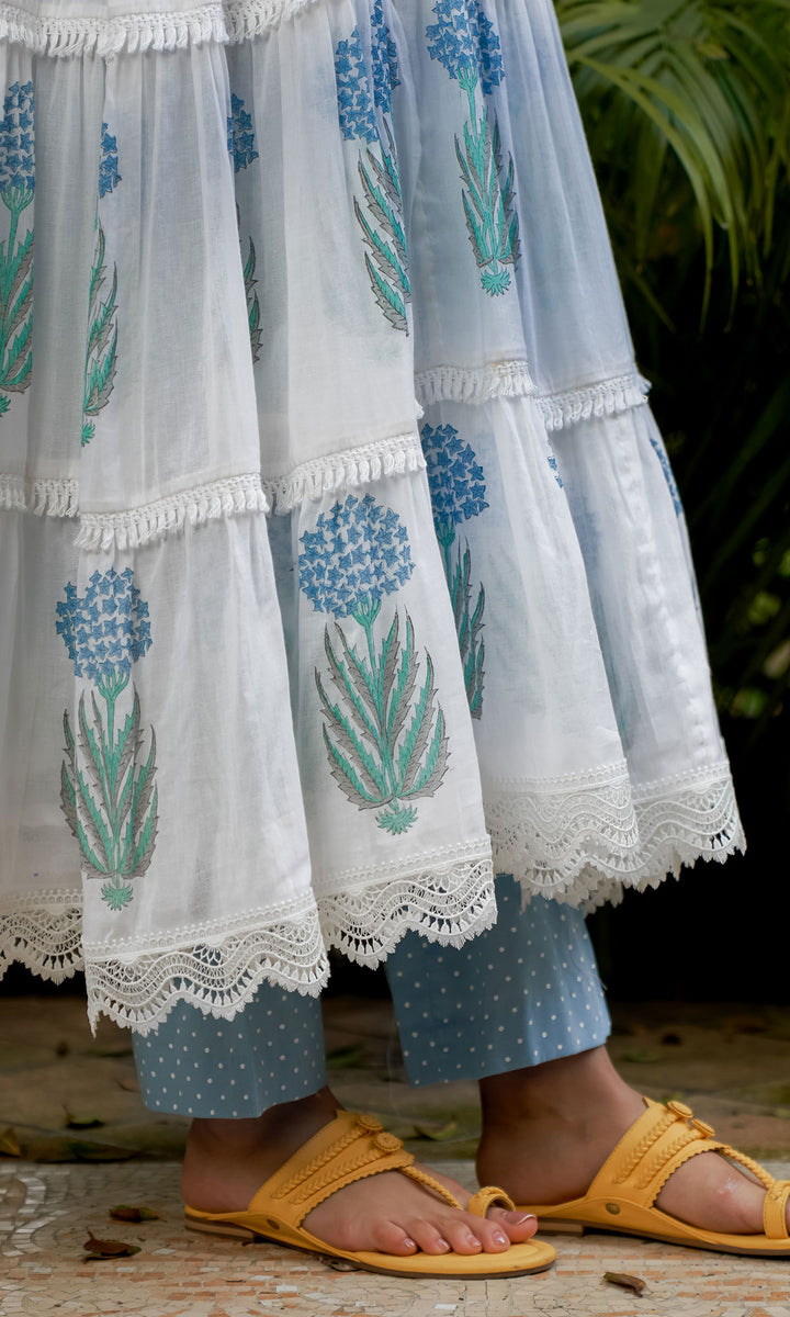 SUKOON POWDER BLUE PRINTED TIERED ANARKALI WITH PANT - SET OF 2