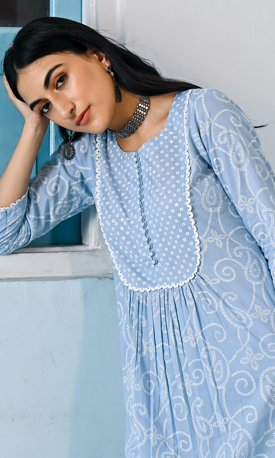 This set includes bandhani block printed kurta , palazzo and dupatta. Lace and potli button detailing in kurta. It comes with block printed palazzo and dupatta. Dupatta has lace detailing.